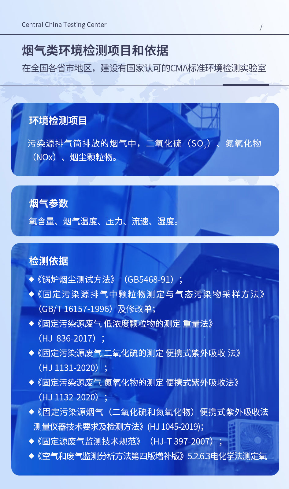 环境检测项目: 污染源排气筒排放的烟气中,二氧化硫(SO2)、氮氧化物(NOx)、烟尘颗粒物。